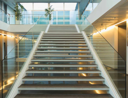 Beispiele für Glastrennwände, Theken und Treppengeländer